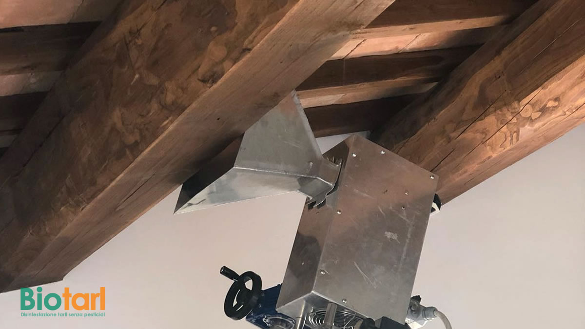 The natural woodworm treatment with bell microwave generator is essentially used to treat in a localized and in-depth way, wooden beams, parquet, etc., suitably positioned (for example with the aid of an electric lifter in the case of beams) before start treatment.